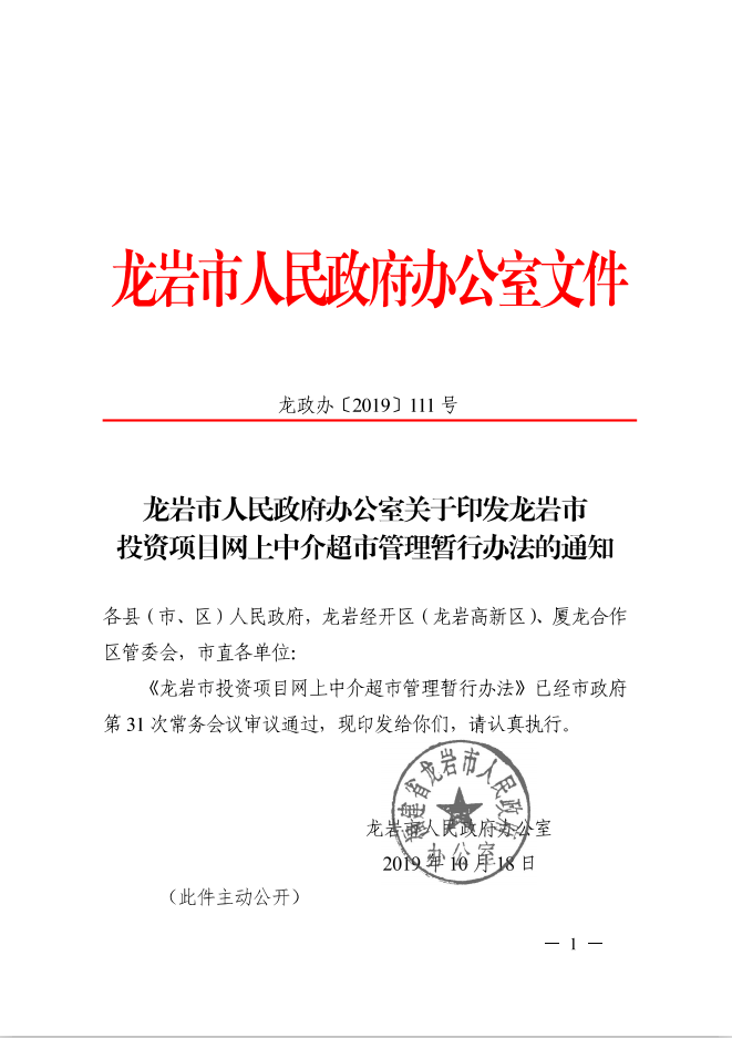 龍巖市人民政府辦公室關于印發龍巖市投資項目網上中介超市管理暫行辦法的通知(龍政辦[2019]111號)